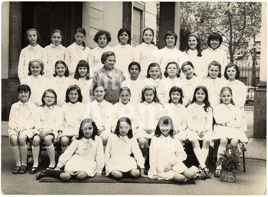akg7279767 SCHOOL Photography souvenir of a female elementary class: 5B. The students wear all the classic white apron distinguished by a light ribbon. In the first row in the middle two twins. The girls smile all or almost, just like the teacher who smiles but who, unlike her pupils, does not look in the car. The weather is cheerful, even a little girl babe takes out her tongue in a mocking expression. The single teacher alone managed the entire class of 30 students, a case not uncommon in the baby boom years, with the schooling set for the achievement of the eighth grade diploma or (alternatively) at the age of 14 years. The numerous successive reforms of the school have begun a period of experimentation that has led to an evolution of teaching, also decreasing the number of students per class and adding one or more colleagues alongside the owner, in order to guarantee to all schoolchildren opportunities to study, and to discourage school leaving in accordance with the increase in the age of the obligation. Group photo in the schoolyard, Milan 1971.