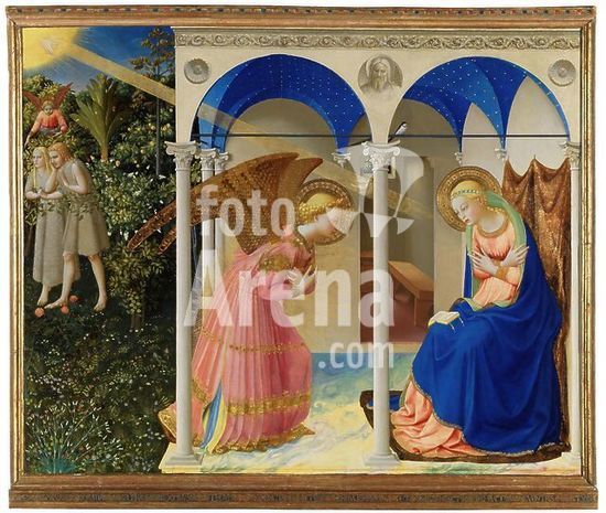 alb4485243 Fra Angelico / 'The Annunciation', ca. 1426, Italian School, Tempera on panel, 194 cm x 194 cm, P00015. Museum: MUSEO DEL PRADO, MADRID, SPAIN. ADAM AND EVE. ANGEL OF THE ANNUNCIATION. EVE. Adam. VIRGIN MARY.