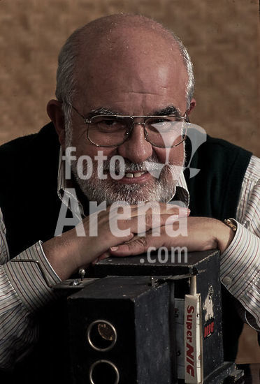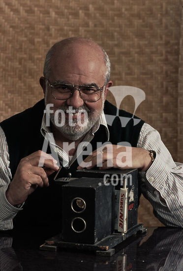 alb17904525 Jaume Figueres. Crítico de cine, apoyado en una cámara antigua. JAUME FIGUERAS.