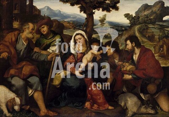 alb2069619 Bonifazio Veronese / 'The Adoration of the Shepherds', ca. 1523, Italian School, Oil on panel, 118 cm x 168 cm, P00269. Museum: MUSEO DEL PRADO, MADRID, SPAIN. SAINT JOSEPH. JESUS. INFANT JESUS. VIRGIN MARY.