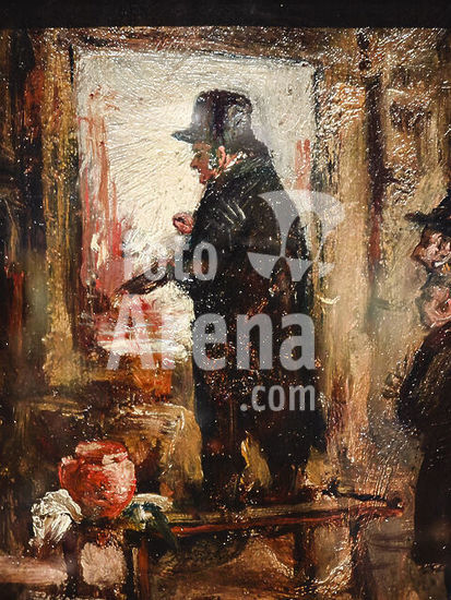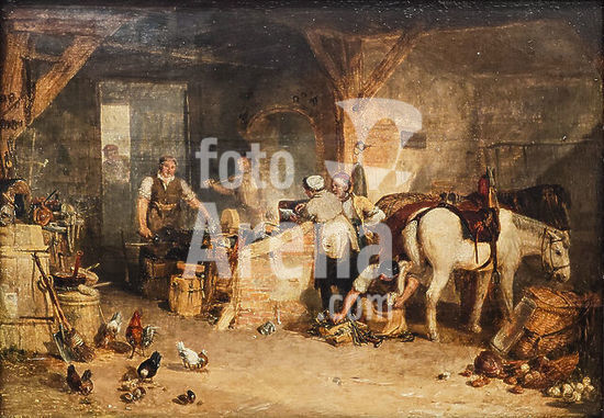 alb21123926 J. M. W. Turner, A Countrt Blacksmith Disputing upon the Price of Iron, and the Price Charged to the Butcher for Shoeing his Poney , 1807 , Oil paint on mahogany, London, England.