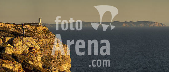alb22609174 woman on Cliffs of El Cap Blanc and views of the Cabrera National Park, municipality of Llucmajor, Mallorca, Balearic Islands, Spain.