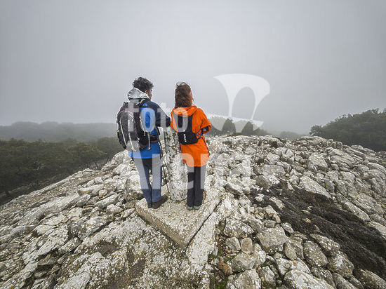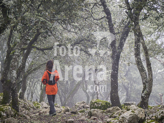alb22608455 Hiker through the fog advancing along a wooded path, Mola de Planicia, Banyalbufar, Natural area of the Serra de Tramuntana., Majorca, Balearic Islands, Spain.