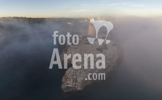 alb22609032 Cala Pi tower enveloped by the fog, 1663 Llucmajor, Mallorca, Balearic Islands, Spain.