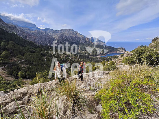 alb22608737 Hikers ascending Puig de Planici via the Son Sanutges pass, Esporles-Banyalbufar, Natural area of the Serra de Tramuntana., Majorca, Balearic Islands, Spain.