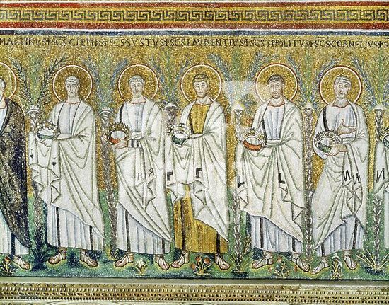 alb339587 Mosaic of procession of Martyrs Saint Clement, Sistus, Lawrence, Hippolytus, Cornelius carrying crown . San Apollinare Nuovo Ravenna. Museum: San Apollinare Nuovo, Ravena, ITALIA.