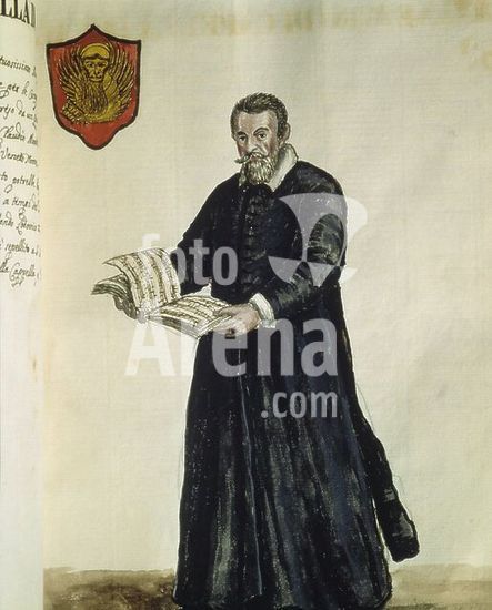 alb345961 Portarit of Claudio Monteverdi (1567-1643), italian composer with the costume of venetians, manuscript, XVIIth century. Museum: MUSEO CORRER, BERLIN, ITALIA.