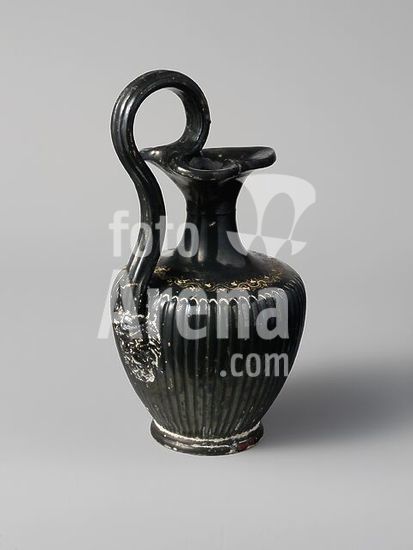alb3599890 Terracotta oinochoe (jug). Culture: Etruscan. Dimensions: H. 8 1/16 in. (20.5 cm). Date: ca. 300 B.C..The type, which clearly imitates more expensive metal vessels, is associated with Volterran workshops. In this case, a definite source of inspiration was Gnathian pottery from Southern Italy. Like this jug, Late Gnathian oinochoai are often ribbed and have elegantly curved handles that terminate in a satyr-head attachment and decorative borders in added color at the shoulder. Museum: Metropolitan Museum of Art, New York, USA.