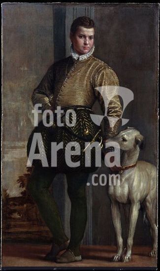 alb3604079 Boy with a Greyhound. Artist: Paolo Veronese (Paolo Caliari) (Italian, Verona 1528-1588 Venice). Dimensions: 68 3/8 x 40 1/8 in. (173.7 x 101.9 cm). Date: possibly 1570s.This portrait was purchased by the great American collectors Harry and Louisine Havemeyer from the noble Martinengo family of Brescia, who believed it to represent a young man related to them from the Colleoni family of neighboring Bergamo. The painting, probably dating to the 1570s, hung in the Martinengo villa and its conception recalls Veronese's illusionistic frescoes in other Veneto villas, in one of which members of the family are shown as though entering the space of the viewer through an open door.The sky, painted in a fugitive smalt blue, has lost most of its color. Museum: Metropolitan Museum of Art, New York, USA.