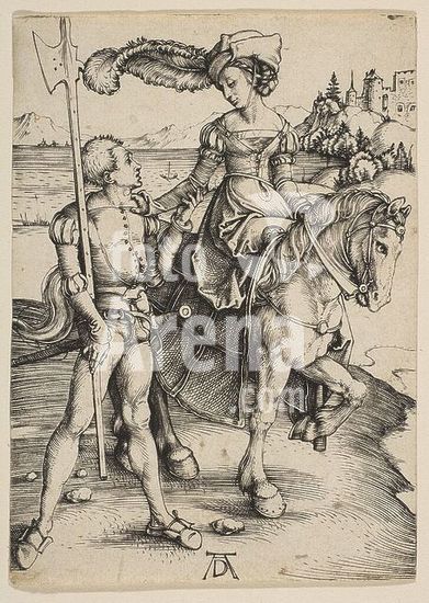 alb3604481 The Lady on Horseback and the Lansquenet. Artist: Albrecht Dürer (German, Nuremberg 1471-1528 Nuremberg). Dimensions: Sheet: 4 1/4 × 3 1/16 in. (10.8 × 7.8 cm). Date: ca. 1497. Museum: Metropolitan Museum of Art, New York, USA.
