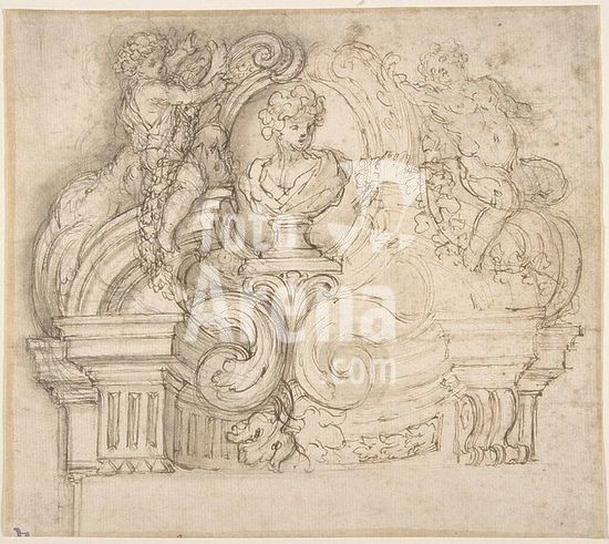 alb3604906 Design for an Overdoor or the Top of a Niche with a Bust and Garland-bearing Putti. Artist: Giovanni Battista Foggini (Italian, Florence 1652-1725 Florence). Dimensions: sheet: 6 7/8 x 7 3/4 in. (17.5 x 19.7 cm). Date: 1652-1725. Museum: Metropolitan Museum of Art, New York, USA.