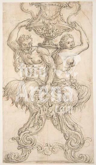 alb3676254 Design for a Statue consisting of a Satyr and Satyress Lifting a Vase. Artist: Attributed to Giovanni Battista Foggini (Italian, Florence 1652-1725 Florence). Dimensions: sheet: 6 15/16 x 3 1/16 in. (17.6 x 7.8 cm). Date: 1652-1725. Museum: Metropolitan Museum of Art, New York, USA.