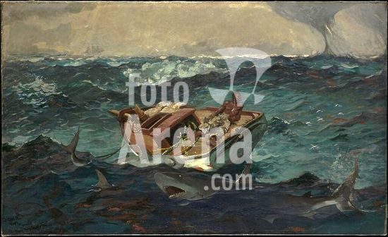 alb3608035 The Gulf Stream. Artist: Winslow Homer (American, Boston, Massachusetts 1836-1910 Prouts Neck, Maine). Dimensions: 28 1/8 x 49 1/8 in. (71.4 x 124.8 cm). Date: 1899.Back in Prouts Neck, Maine, after one of his winter visits to the Bahamas, Homer painted this dramatic scene of imminent disaster. A man faces his demise on a dismasted, rudderless fishing boat, sustained by only a few stalks of sugarcane and threatened by sharks and a distant waterspout. He is oblivious to the schooner on the left horizon, which Homer later added to the canvas as a sign of hopeful rescue. Some art historians have read The Gulf Stream as symbolic, connecting it with the period's heightened racial tensions. The painting has also been interpreted as an expression of Homer's presumed sense of mortality and vulnerability following the death of his father. Museum: Metropolitan Museum of Art, New York, USA.