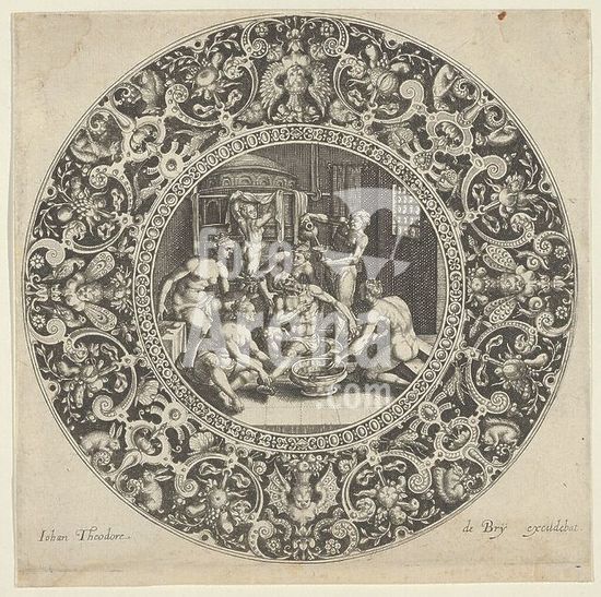 alb3608556 Sardanapal in the Bath. Artist: after Maerten de Vos (Netherlandish, Antwerp 1532-1603 Antwerp); Johann Theodor de Bry (Netherlandish, Strasbourg 1561-1623 Bad Schwalbach); After Crispijn de Passe the Elder (Netherlandish, Arnemuiden 1564-1637 Utrecht). Dimensions: Sheet: 2 1/2 × 2 9/16 in. (6.4 × 6.5 cm). Date: 1576-1623.A scene with the bearded figure of Sardanapal, the Assyrian king, in a bath at center, surrounded by six attending slaves. The scene is framed by a circular ornamental frieze with pairs of animals and groupings of fruit. Copied from a rectangular print by Crispijn de Passe I (Hollstein XV.142.119), after a drawing by Maerten de Vos. Museum: Metropolitan Museum of Art, New York, USA.