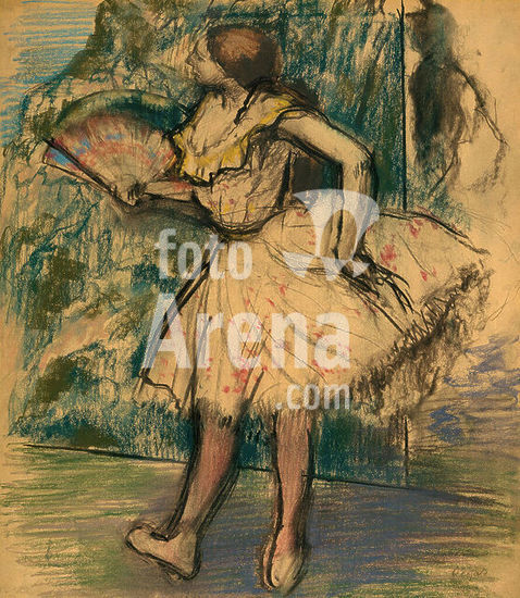 alb3615762 Dancer with a Fan. Artist: Edgar Degas (French, Paris 1834-1917 Paris). Dimensions: 21 7/8 x 19 1/4 in. (55.6 x 48.9 cm). Date: ca. 1890-95.This is a study for the second figure from the left in Degas's pastel of the 1890s Ballet Dancers in the Wings (Saint Louis Art Museum). In the background is a brightly colored stage flat. Museum: Metropolitan Museum of Art, New York, USA.
