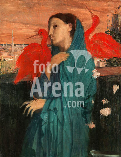 alb3615878 Young Woman with Ibis. Artist: Edgar Degas (French, Paris 1834-1917 Paris). Dimensions: 39 3/8 x 29 1/2 in. (100 x 74.9 cm). Date: 1860-62.Degas made sketches of this composition in a notebook he used during his second stay in Rome in 1857-58. Originally conceived as a depiction of a pensive woman, the picture assumed a mysterious air when Degas added the imaginary Middle Eastern cityscape, the pink flowers, and the two red ibises around 1860-62. About the same time he also considered adding the brilliant birds to his large historical painting Semiramis Building Babylon (Musée d'Orsay, Paris). Museum: Metropolitan Museum of Art, New York, USA.