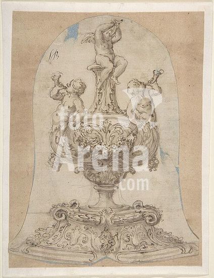 alb3617560 Design for a Vessel with Two Tritons Blowing Horns and a Winged Putto on Top. Artist: Attributed to Giovanni Battista Foggini (Italian, Florence 1652-1725 Florence). Dimensions: sheet: 7 1/4 x 5 9/16 in. (18.4 x 14.2 cm). Date: 1652-1725. Museum: Metropolitan Museum of Art, New York, USA.
