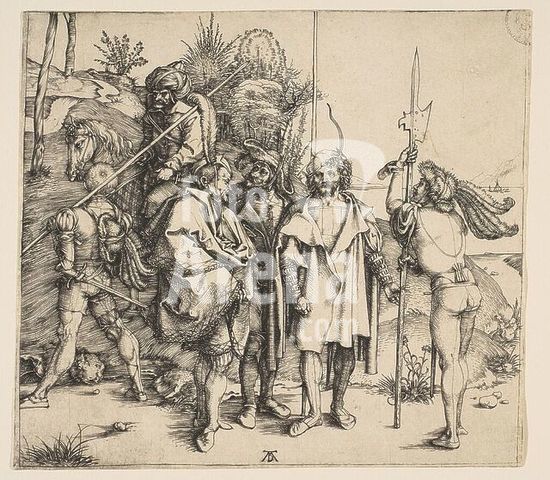 alb3617817 Five Foot Soldiers and a Mounted Turk. Artist: Albrecht Dürer (German, Nuremberg 1471-1528 Nuremberg). Dimensions: plate: 5 1/4 x 5 3/4 in. (13.3 x 14.7 cm). Date: ca. 1495. Museum: Metropolitan Museum of Art, New York, USA.