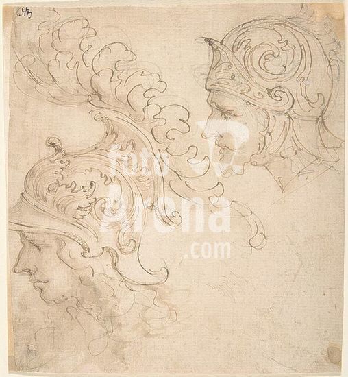 alb3620202 Two Studies for Helmet Designs Presented En Profil. Artist: Giovanni Battista Foggini (Italian, Florence 1652-1725 Florence). Dimensions: sheet: 7 3/8 x 6 13/16 in. (18.8 x 17.3 cm). Date: 1652-1725. Museum: Metropolitan Museum of Art, New York, USA.