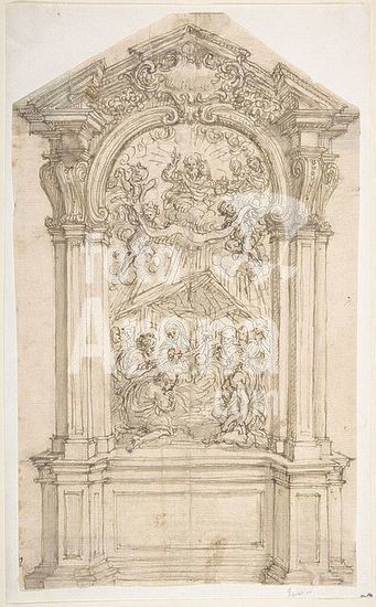 alb3621345 Design for an Altar with a Painting of the Adoration of the Shepherds and God the Father Above. Artist: Giovanni Battista Foggini (Italian, Florence 1652-1725 Florence). Dimensions: sheet: 9 3/4 x 5 7/8 in. (24.7 x 15 cm). Date: 1652-1725. Museum: Metropolitan Museum of Art, New York, USA.