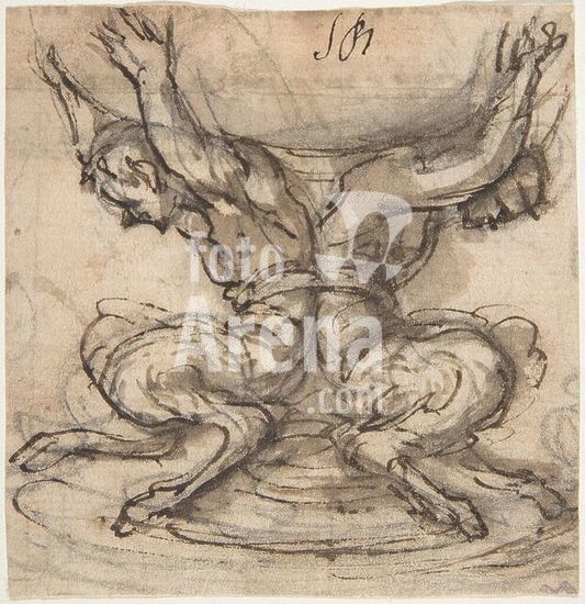 alb3621379 Design for the Base of a Vessel with Two Satyrs. Artist: Giovanni Battista Foggini (Italian, Florence 1652-1725 Florence). Dimensions: sheet: 3 7/8 x 3 3/4 in. (9.9 x 9.6 cm). Date: 1652-1725. Museum: Metropolitan Museum of Art, New York, USA.