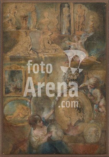 alb3622076 Allegory of Louis XV as Patron of the Arts with Paintings and Sculpture from the Salon of 1769. Artist: Gabriel de Saint-Aubin (French, Paris 1724-1780 Paris). Dimensions: Sheet: 8 3/8 × 5 5/8 in. (21.3 × 14.3 cm). Date: ca. 1769.Saint-Aubin made copious sketches of works shown at the Salon, and this drawing features a compilation of several paintings and sculptures on view at the exhibition of 1769. All the sculptures depicted here have been identified and confirmed as having been on display, though the proportions of many objects have been manipulated. Rather than a painstaking recreation of the works on view, this drawing represents Saint-Aubin's rumination on artistic production: allegorical figures of the arts descend upon clouds to honor King Louis XV as a great patron, presenting his portrait to the viewer. Museum: Metropolitan Museum of Art, New York, USA.
