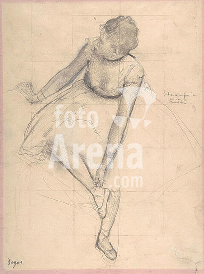 alb3622133 Dancer Adjusting Her Slipper. Artist: Edgar Degas (French, Paris 1834-1917 Paris). Dimensions: Sheet: 13 x 9 5/8 in. (33 x 24.4cm). Date: 1873.Between 1873 and 1874, Degas made several studies of dancers adjusting their shoes, shown in different poses and from different angles. These drawings served as preparatory studies for his ballet scenes of the same period. Squared for transfer, the figure in this study was used in the 1874 pastel Dancers Resting (private collection); her tenuously held pose characterizes Degas's approach to his models. The same dancer, shown in three-quarter view, also appears in The Rehearsal of the Ballet Onstage in the Museum's collection (29.160.26). Museum: Metropolitan Museum of Art, New York, USA.