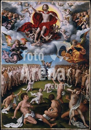 alb3622608 The Last Judgment. Artist: Joos van Cleve (Netherlandish, Cleve ca. 1485-1540/41 Antwerp). Dimensions: 48 3/4 x 34 in. (123.8 x 86.4 cm). Date: ca. 1520-25.This majestic scene is divided into heavenly and earthly zones, which are linked by two hovering angels blowing trumpets. Christ appears at the moment of judgment in a burst of light and color, surrounded by clouds and putti and flanked by the apostles. He blesses the saved, shown at lower left, while Saint Michael shepherds the damned into hell burning in the distance at the right. The nudes in the foreground reflect the artist's study of prints after Raphael's designs, and the figure of Christ seems to be inspired by the famous ancient sculpture of the Laocoön. Museum: Metropolitan Museum of Art, New York, USA.