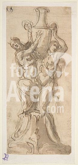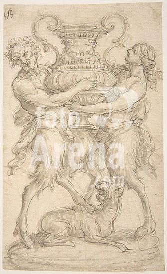 alb3625836 Design for a Sculpture consisting of a Satyr and Satyress holding a Vase. Artist: Giovanni Battista Foggini (Italian, Florence 1652-1725 Florence). Dimensions: sheet: 7 7/16 x 4 1/2 in. (18.9 x 11.4 cm). Date: 1652-1725. Museum: Metropolitan Museum of Art, New York, USA.
