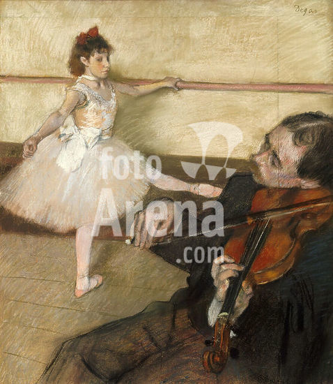 alb3627008 The Dance Lesson. Artist: Edgar Degas (French, Paris 1834-1917 Paris). Dimensions: 25 3/8 x 22 1/8 in. (64.5 x 56.2 cm). Date: ca. 1879.Degas made various adjustments to this composition, presumably to accommodate the violinist in his final design. He added strips of paper at the top and to the right, and there is evidence to suggest that he may have altered the dancer's pose. A pastel study for the musician is in the Museum's collection (19.51.1). The present work was formerly owned by Gustave Caillebotte, who probably bought it from or soon after the Impressionist exhibition of 1879. In 1894 he bequeathed it to Renoir, who sold it shortly thereafter. Museum: Metropolitan Museum of Art, New York, USA.