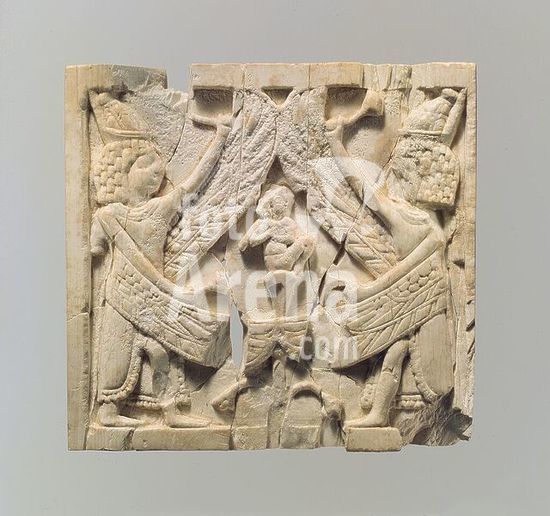 alb3627370 Furniture plaque carved in relief showing two winged, male figures flanking an infant on a lotus flower. Culture: Assyrian. Dimensions: 3.25 x 3.12 in. (8.26 x 7.92 cm). Date: ca. 9th-8th century B.C..During the early first millennium B.C., ivory carving was one of the major luxury arts that flourished throughout the ancient Near East. Elephant tusks were carved into small decorative objects such as cosmetic boxes and plaques used to adorn wooden furniture. Gold foil, paint, and semiprecious stone and glass inlay embellishments enlivened these magnificent works of art. Based on certain stylistic, formal, and technical characteristics also visible in other media, scholars have distinguished several coherent style groups of ivory carving that belong to different regional traditions including Assyrian, Phoenician, North Syrian and South Syrian (the latter also known as Intermediate).Several ivories in the Metropolitan Museum's collection are from the Aramaean town of Arslan Tash, ancient Hadatu, in northern Syria just east of the Euphrates River, close to the modern Turkish border. French archaeological excavations at the site in 1928 revealed city walls and gates in addition to a palace and temple that were built when the Neo-Assyrian king Tiglath-Pileser III (744-721 B.C.) turned the town into a provincial capital and military outpost. During the excavations, over one hundred ivory furniture inlays that can be attributed to the South Syrian and Phoenician styles were found in a building near the palace. One piece bears a dedicatory inscription in Aramaic to King Hazael, mentioned in the Bible, who ruled Damascus during the second half of the 9th century (ca. 843-806 B.C.), suggesting that this collection of ivory furniture inlays could have been taken by the Assyrian state as tribute or booty from Damascus. The Arslan Tash ivories share an amalgamation of Egyptianizing motifs typical of the Phoenician style and forms characteristic of North Syrian art that may indicate a South Syrian or Damascene origin of this group. Today, these ivories are housed in museums in Paris, Aleppo, Jerusalem, Karlsruhe, and Hamburg, as well as The Metropolitan Museum of Art.This square plaque is carved in low relief and depicts two standing, winged male figures facing each other, set within a thin frame and flanking a central infant sitting on a lotus flower. Both male figures hold lotus buds in each hand and raise one arm and wing to the upper edge of the plaque while lowering the other arm and wing so that their wingtips touch to frame the seated infant. The plaque can be attributed to the South Syrian style, drawing upon elements from both the Phoenician and North Syrian traditions of ivory carving. Aspects of the North Syrian style include large eyes and noses and fringed robes that leave one leg exposed. The Phoenician style incorporates Egyptian features such as the pschent crown (the double crown of Upper and Lower Egypt), short wigs, incised broad collars, and the composition of the figures' bodies: face and feet in profile with a frontal chest. Gold foil survives on the upper wing of the figure on the left. There are two West Semitic letters inscribed into the roughened reverse of the plaque, probably as a guide for the assembly of the piece of furniture to which it originally belonged. The motif of an infant sitting on a lotus flower is known from Egyptian art where it evokes the birth of Horus, the Egyptian sky god, or the birth of Ra, the Egyptian sun god. This imagery became significant in the Nile Valley during the Third Intermediate Period, a time that coincided with Phoenician presence in the Levant. On this plaque, the infant holds the flail, an emblem of Egyptian royalty that resembles the flywhisk. Another ivory plaque in the Metropolitan Museum's collection that was found at the Neo-Assyrian capital of Nimrud bears similar imagery in a more elaborate Phoenician style (MMA 59.107.16). Museum: Metropolitan Museum of Art, New York, USA.