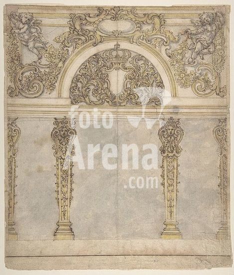 alb3629690 Design for an Alcove with a Coat of Arms Flanked by Putti Bearing a Crown, Supported by Pilasters with Human Heads in Capitals. Artist: Giovanni Battista Foggini (Italian, Florence 1652-1725 Florence). Dimensions: sheet: 11 5/16 x 9 3/4 in. (28.7 x 24.8 cm). Date: 1652-1725. Museum: Metropolitan Museum of Art, New York, USA.
