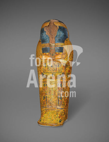 alb3630487 Outer Coffin of the Singer of Amun Nany. Dimensions: l. 228 cm (89 3/4 in); w. 83 cm (32 11/16 in). Dynasty: Dynasty 21. Reign: reign of Psusennes I. Date: ca. 1050.Nany was buried in a set of nesting coffins which included an outer coffin (30.3.23a, b), an inner coffin (30.3.24a, b), and the mummy cover (30.3.25). The faces may originally have been gilded, which would explain why each was removed in ancient times. Museum: Metropolitan Museum of Art, New York, USA.