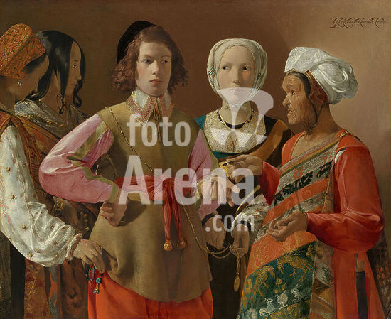 alb3631674 The Fortune-Teller. Artist: Georges de La Tour (French, Vic-sur-Seille 1593-1653 Lunéville). Dimensions: 40 1/8 x 48 5/8 in. (101.9 x 123.5 cm). Date: probably 1630s.While an old gypsy crone tells his fortune, a naive youth is robbed by her accomplices, a subject popular among Caravaggesque painters throughout Europe in the seventeenth century. La Tour's painting can be interpreted as a genre or theatrical scene, or as an allusion to the parable of the prodigal son. The inscription on the painting includes the name of the town where La Tour lived, Lunéville in Lorraine. Museum: Metropolitan Museum of Art, New York, USA.