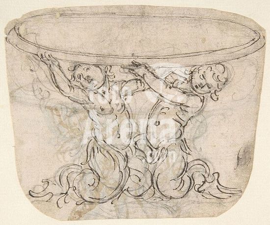 alb3632086 Table or Basin Supported by Male Sirens (recto); Sketch for the Same Subject (verso) . Artist: Attributed to Giovanni Battista Foggini (Italian, Florence 1652-1725 Florence). Dimensions: sheet: 3 5/16 x 4 in. (8.4 x 10.2 cm). Date: 1652-1725. Museum: Metropolitan Museum of Art, New York, USA.