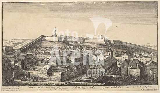 alb3632199 Prospect of the inner part of Tangier. Artist: Wenceslaus Hollar (Bohemian, Prague 1607-1677 London). Dimensions: Sheet: 4 3/4 × 8 3/8 in. (12 × 21.3 cm). Series/Portfolio: Various views of TangierTitle and five plates. Date: ca. 1670.View of Tangier, with Peterborough Tower; horses in the foreground, and various figures in the market place; in the distance, the coast of Spain. Museum: Metropolitan Museum of Art, New York, USA.