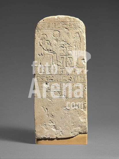 alb3632880 Stela of the Singer in the Interior of Amun, Djedbastetemtehou, from Mefkat. Dimensions: H. 49.5 × W. 21.5 × Th. 10.5 cm (19 1/2 × 8 7/16 × 4 1/8 in.). Dynasty: Dynasty 25-early Dynasty 26. Date: ca. 690-650 BC.Djedbastetemtehou is shown seated in the lunette of this stela, raising a large mirror and receiving offerings from a smaller standing woman, Irtirw. A line of inscription at the top gives Djedbastetemtehou's title as Singer in the Interior of Amun, an important office in the temple of Amun in the city of Thebes. Lines of inscription below cite the goddess Hathor in the town of Mefkat in the West Delta, a town newly prominent at this time, on behalf of Djedbastetemtehou. Apparently she traveled from a home in Mefkat about four hundred miles to the south to serve as a religious singer at Thebes, probably sent by her father to receive this honor.The stela is graphically striking with the beautiful linear slimness and round strong visages of the women, the large mirror disk, and elegant double register lines used through the inscription. It also provides clear testament to the tendency to look to models from much earlier periods in art at the end of the Third Intermediate Period: the figural styles and the dog-collar necklace hark back to the Old Kingdom almost two millennia earlier, while the oversize mirror here alludes to Hathor but recalls Middle Kingdom toilette scenes. Museum: Metropolitan Museum of Art, New York, USA.
