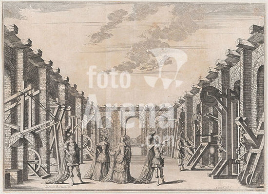 alb3633786 Two men in classical armor and two women looking at the mechanical devices on either side of an open courtyard; set design from 'Il Fuoco Eterno'. Artist: Mathäus Küsel (German, 1621-1682); after Ludovico Ottaviano Burnacini (Italian, Mantua 1636-1707 Vienna (active Austria)). Dimensions: Sheet (Trimmed): 12 3/16 × 16 7/8 in. (31 × 42.8 cm). Date: 1674.One of twelve plates depicting the stage sets designed by Lodovico Burnacini for 'Il Fuoco Eterno Custodito Dalle Vestali', an opera celebrating the birth of Maria Anna Antonia, Archduchess of Austria in 1672. The Archduchess was the daughter of Emperor Leopold I and his second wife Claudia Felicitas, heiress of Tirol. Composed by Antonio Draghi with a libretto by Nicoló Minato, the opera was performed in the Hoftheater in Vienna on October 30, 1674. Museum: Metropolitan Museum of Art, New York, USA.
