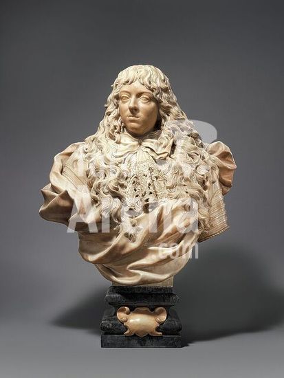 alb3635175 Ferdinando de' Medici (1663-1713), Grand Prince of Tuscany. Artist: Giovanni Battista Foggini (Italian, Florence 1652-1725 Florence). Culture: Italian, Florence. Dimensions: Overall (confirmed): 38 3/4 × 28 7/8 × 14 in., 337 lb. (98.4 × 73.3 × 35.6 cm, 152.9 kg). Date: ca. 1680-82.These meltingly carved busts of father (1993.332.1) and son are surely the finest examples of the portrait style of G. B. Foggini, the leading sculptor of the Florentine Baroque. While strong echoes of Bernini date the creation of the pair to shortly after the younger artist's return from Rome, they already exhibit Foggini's talent for the depiction of material opulence that earned him the post of Medici court sculptor. Dynamic contrasts abound: the fragile lace cravats and lavish mantles (emulating modes of the contemporary French court) set off the realistically depicted faces. They in turn provide their own study in contrasts: the commanding pose and classic Habsburg physiognomy of the balding father serve as counterpoint to the sweet, somewhat unformed face of the youth, overwhelmed by a delirious cascade of curls. Foggini's artistic genius inaugurated the final flourish of Medici patronage. These busts, modeled from life, were followed by a series portraying other family members, all intended to promote the political aspirations of the fading dynasty. Their acquisition served to link our major series of Roman Baroque portrait busts to a growing collection of stunning small-scale Florentine sculptures of that period. Museum: Metropolitan Museum of Art, New York, USA.