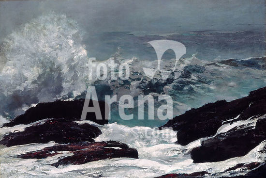 alb3636537 Maine Coast. Artist: Winslow Homer (American, Boston, Massachusetts 1836-1910 Prouts Neck, Maine). Dimensions: 30 x 40 in. (76.2 x 101.6 cm). Date: 1896.William Howe Downes, Homer's first biographer, had firsthand knowledge of the coast at Prouts Neck, Maine. He described this canvas as follows: "The design is of a rigid simplicity. We are looking seaward from the cliffs at Prouts Neck on a day of storm. At our feet the dark ledges are streaming with milky retreating foam, and just beyond them a monster wave raises its huge bulk as it comes shoreward with an exuberant look of tremendous power. Still further out to sea, in the gray mist, loom the oncoming lines of wave upon wave, until the horizon loses itself in a far turmoil of dimly seen billows.". Museum: Metropolitan Museum of Art, New York, USA.