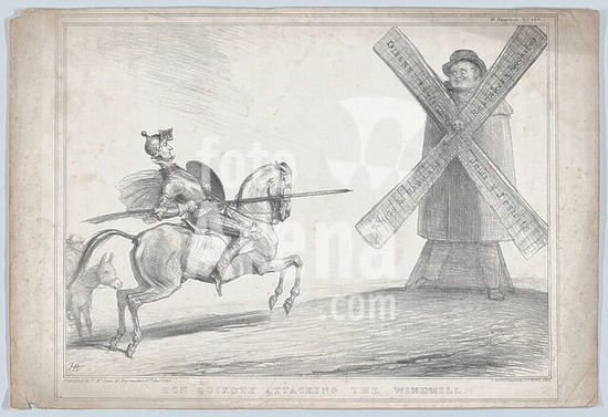 alb3649442 Don Quixote Attacking the Windmill. Artist: John Doyle (Irish, Dublin 1797-1868 London). Dimensions: Sheet: 11 5/8 × 17 5/16 in. (29.5 × 44 cm). Lithographer: Alfred Ducôte (British, active 1830-40). Publisher: Thomas McLean (British, active London 1788-1885). Series/Portfolio: HB Sketches, No. 420. Subject: Daniel O'Connell (Irish, Cahirciveen, Kerry 1775-1847 Genoa); Sir Francis Burdett, 5th Baronet (British, 1770-1844). Date: December 11, 1835. Museum: Metropolitan Museum of Art, New York, USA.