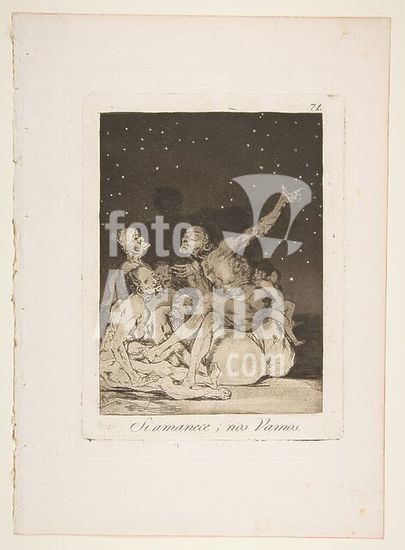 alb3649539 Plate 71 from 'Los Caprichos': When day breaks we will be off (Si amanece; nos Vamos.). Artist: Goya (Francisco de Goya y Lucientes) (Spanish, Fuendetodos 1746-1828 Bordeaux). Dimensions: Plate: 7 11/16 x 5 7/8 in. (19.6 x 14.9 cm)Sheet: 11 9/16 × 8 1/4 in. (29.4 × 21 cm). Series/Portfolio: Los Caprichos. Date: 1799. Museum: Metropolitan Museum of Art, New York, USA.