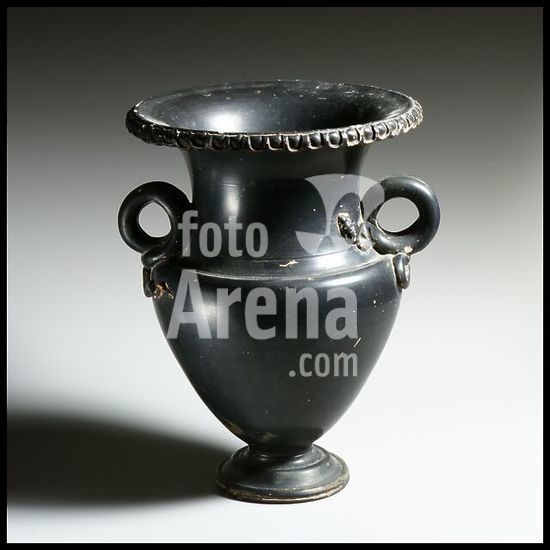 alb3651891 Terracotta krateriskos (small mixing bowl). Culture: Etruscan. Dimensions: H. 9 1/2 in. (24.1 cm). Date: ca. 300 B.C..The distinctive ring handles are in the form of two snakes whose heads and tails are modeled carefully in relief. Snakes were often connected with death and rebirth in the ancient Mediterranean world. At least one vase of this specific type is known to have been used as a cremation urn. Museum: Metropolitan Museum of Art, New York, USA.