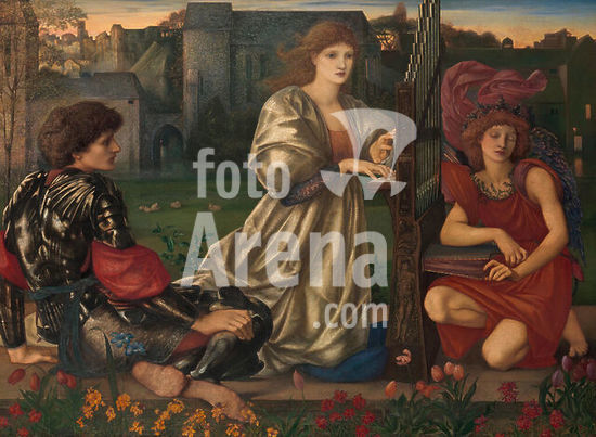alb3653374 The Love Song. Artist: Sir Edward Burne-Jones (British, Birmingham 1833-1898 Fulham). Dimensions: 45 x 61 3/8 in. (114.3 x 155.9 cm). Date: 1868-77.Burne-Jones associated this painting with a refrain from a Breton folk ballad: "Alas, I know a love song, / Sad or happy, each in turn." Drawing inspiration from the gothicizing Pre-Raphaelite movement, the artist conjured a twilight scene with a richly romantic, medieval air, enhanced by allusions to Italian Renaissance art, from the warm, dewy colors to the gracious figures and original frame, which recalls sixteenth-and-seventeenth-century Venetian designs. When the picture was first exhibited at the Grosvenor Gallery, London, in 1878, the novelist Henry James admiringly compared it to "some mellow Giorgione or some richly-glowing Titian.". Museum: Metropolitan Museum of Art, New York, USA.