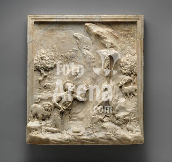 alb3659959 Saint Jerome in the Wilderness. Artist: Probably by Antonio Rossellino (Italian, Settignano 1427-ca. 1479 Florence). Culture: Italian, Florence. Dimensions: Overall (confirmed): 16 5/8 × 15 1/4 × 2 7/8 in., 31 lb. (42.2 × 38.7 × 7.3 cm, 14.0615kg). Date: ca. 1470.The Metropolitan displays in its galleries an important group of quattrocento reliefs of the Madonna and Child by such Italian Renaissance masters as Antonio Rossellino (see acc. no. 14.40.675) and Benedetto da Maiano (see acc. no. 41.190.137). Until Saint Jerome in the Wilderness entered the collection, however, the Museum had no example of a classic narrative relief. Beginning in 1424, when Lorenzo Ghiberti's first set of bronze doors for the Baptistery was set in place, narrative reliefs held signal importance in Florentine art. (It was Ghiberti who invented the device, echoed here, of showing the foreground spilling over the frame in the reliefs for his second set of Baptistery doors, the "Gates of Paradise.")[1] Small reliefs like this marble were often made for private devotions in a family chapel. The 1553 inventory of the Palazzo della Signoria, Florence, for example, mentions a low relief of Saint Jerome,[2] which could have been this one, although it is usually associated with a work by Desiderio da Settignano in the National Gallery of Art in Washington, D.C.[3] The subject is unsurprising: images of this gaunt ascetic abounded in the 1470s, as is attested by paintings attributed to Andrea del Verrocchio (Palazzo Pitti, Florence) and by Leonardo da Vinci (Pinacoteca, Vatican).Widely read during the Renaissance, Jerome's letters vividly describe his physical and spiritual trials in the desert outside Bethlehem, where, he tells us, he would "set up my oratory, and make that spot a place of torture for my unhappy flesh."[ 4] Furthermore, the best-selling compilation of saints' lives, Jacobus de Voragine's Golden Legend, relates charming stories of his relationships with animals, which are often woven into depictions of the present scene. We learn that he befriended a lion; the lion teamed up with a donkey to carry wood to Jerome's monastery; and some camel-driving merchants stole the donkey. These tales account for the lion, lioness, and camel in the relief. It is, in fact, a virtual bestiary: the stag, for instance, may be explained by the following passage from the Song of Solomon, "Behold, he cometh leaping upon the mountains, skipping upon the hills. My beloved is like a roe or a young hart," which is often interpreted in Renaissance exegesis as a reference to Christ, whose cross rises above the animal here. Other creatures -- a squirrel and a dragon -- also carried symbolic meaning in contemporary writings.[5]The references to religious and secular literature made this a stirring image in fifteenth-century Florence, yet it is the airy landscape that draws the viewer into the scene and encourages him or her to linger over its delightful details. Jerome and the animals inhabit a mountainous region that conjures atmosphere and depth within the compact limits of the relief. Twin peaks curve toward the saint as if sheltering him within the hollow at their base. As Jerome kneels on the rocky stage in the foreground, the lions stand or sit on ledges receding to the left; in the distance a trader and his camel disappear behind a crag. Jutting from an outcrop, the crucifix separates Jerome from the right side of the pictorial space, where beasts and foliage hint at a passage behind the peaks. Using a mountainous landscape to separate a composition into discrete areas was pioneered by Ghiberti in the Baptistery reliefs and by such artists as Domenico Veneziano in painting. Borrowing that formal device, the sculptor of this relief carved the marble intuitively, suggesting recession into depth rather than constructing it through the rules of one-point perspective. Careful observations of striated rock, different varieties of leaves, and wispy clouds breathe life into this natural world.The style of the work closely resembles that of a set of reliefs in Faenza Cathedral. Giorgio Vasari credited them to Benedetto da Maiano, but many later scholars have attributed them to Benedetto's master, Antonio Rossellino. [6] In 1985, however, Gary M. Radke returned the attribution to Benedetto, finding that they forecast another, slightly later set of reliefs by him in the chapel of Santa Fina, San Gimignano.7 Radke pointed out that in the Faenza reliefs the manner in which the foreground figure is related to the mountains, the use of foliage to fill out the middle ground, and the placement of animals in the background are all aspects of Benedetto's sensibility as well as Rossellino's. Even Mario Scalini, a scholar who attributes the Museum's relief to Rossellino, dates it to the 1470s by relating it to Benedetto's Stigmatization of Saint Francis in the church of Santa Croce, Florence.[8] And because it is clearly dependent on Rossellino's sculptural formulas, our relief was not surprisingly identified as his work when it was auctioned in New York in 1918.[9] Radke's arguments for Benedetto's authorship of the Faenza reliefs -- citing Benedetto's keen interest in narrative and his blocky figures and rich surface ornamentation -- are attractive, but the eminent scholar Francesco Caglioti continues to believe that Rossellino and his workshop were responsible.[10] Clearly, whoever carved the Faenza reliefs also carved the Museum's Saint Jerome in the Wilderness.Although we have no written record of its authorship, this relief's renown in the Renaissance is confirmed by the existence of two copies. A glazed terracotta of about 1510 attributed to Luca della Robbia the Younger (1475 - 1548) in the Casa Buonarroti, Florence, is clearly based on the composition, which the artist clarified through color, thereby losing atmospheric perspective.[11] There are a few changes in the details, but the basic form and the dimensions are the sa
