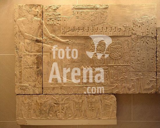 alb3664613 Relief from the North Wall of a Chapel of Ramesses I. Dimensions: H. 139.7 × W. 165.1 cm (55 × 65 in.). Dynasty: Dynasty 19. Reign: reign of Seti I. Date: ca. 1295-1294 B.C..On the North wall of his chapel at Abydos, Ramesses I is shown as the deceased king who has become one with the god Osiris. The dead king's image is seated, his hand stretched toward a small offering table. To the right of the table are piles of offerings and above these is an offering list. The small figures on the lower right are performing the rituals that accompanied the presentation of the offerings.Below the figure of Ramesses are a group of Nile gods, two of whom tie the symbols of Upper and Lower Egypt (the papyrus and lotus plants) around the hieroglyph that means union. On either side of these figures, other Nile gods bring vases of fresh water symbolizing "life, all happiness, all food, all provisions."Ramesses I, first king of Dynasty 19, came to the throne as an elderly man. This chapel and most other monuments dedicated to Ramesses were built or completed by his son and successor Seti I. Museum: Metropolitan Museum of Art, New York, USA.