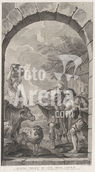 alb3656452 The Chapel of the Enfants-Trouvés in Paris: Groupe des bergers près d'un puits. Artist: Etienne Fessard (French, Paris 1714-1777 Paris); After Charles Joseph Natoire (French, Nîmes 1700-1777 Castel Gandolfo). Dimensions: Sheet (Trimmed): 20 1/2 × 11 1/8 in. (52 × 28.2 cm). Date: 1757.From a series of fifteen plates engraved by Fessard after the paintings by Natoire in the Chapel of the Enfants-Trouvés, Paris. The chapel was built in 1746-50 based on designs by Germain Boffrand, but destroyed in the 19th century. The main altar depicted The Adoration of the Magi and subsidiary scenes included the children and nuns of the orphanage as onlookers. Natoire's scenes were set into trompe l'oeil surrounds painted by Paolo Antonio and Gaetano Brunetti, giving the illusion that the viewer was standing in a ruined building. Fessard's suite of prints includes a perspective view of the interior based on a drawing by Augustin de Saint-Aubin. Museum: Metropolitan Museum of Art, New York, USA.