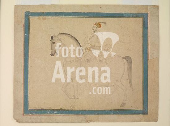 alb3671198 Nawab Muzaffar 'Ali Khan on Horseback. Artist: Attributed to Rai Kalyan Das (Chitarman II) (active 1715-60). Dimensions: 7 7/8 x 9 5/8 in. (20 x 24.4 cm). Date: ca. 1730.Muzaffar 'Ali Khan was governor of Ajmer under the emperor Muhammad Shah (r. 1719-48), and was killed in 1739 at the Battle of Karnal. His portrait can be attributed to Rai Kalyan Das, the artist known as Chitarman II, after the legendary artist who had worked for Shah Jahan a century earlier. Under Chitarman II's guidance, Mughal court painting experienced a resurgence, although the size of the imperial workshop never regained the heights of the earlier period. Museum: Metropolitan Museum of Art, New York, USA.