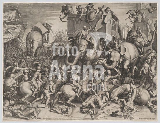 alb3672484 The Battle Between Scipio and Hannibal at Zama. Artist: After Giulio Romano (Italian, Rome 1499?-1546 Mantua); Cornelis Cort (Netherlandish, Hoorn ca. 1533-1578 Rome). Dimensions: sheet: 16 5/16 x 21 1/4 in. (41.4 x 53.9 cm). Date: 1550-78. Museum: Metropolitan Museum of Art, New York, USA.