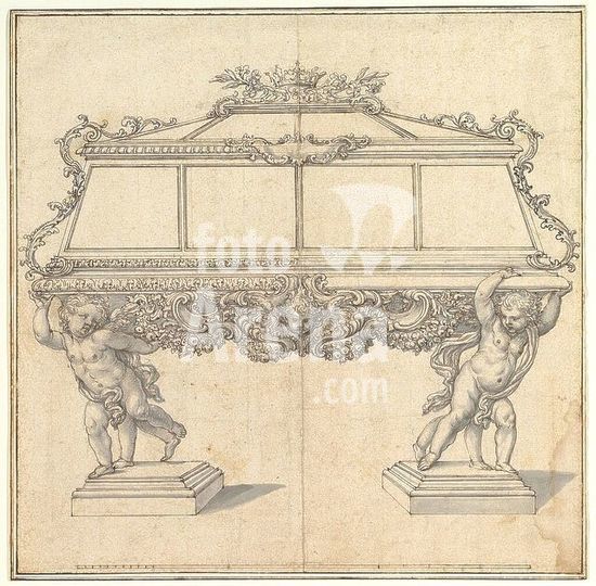 alb3673827 Design for a Sarcophagus Supported by Putti for the Church of S. Maria Maddalena de' Pazzi, Florence. Artist: Giovanni Battista Foggini (Italian, Florence 1652-1725 Florence) (family and workshop). Dimensions: sheet: 14 x 14 1/2 in. (35.6 x 36.8 cm). Date: 1652-1725. Museum: Metropolitan Museum of Art, New York, USA.